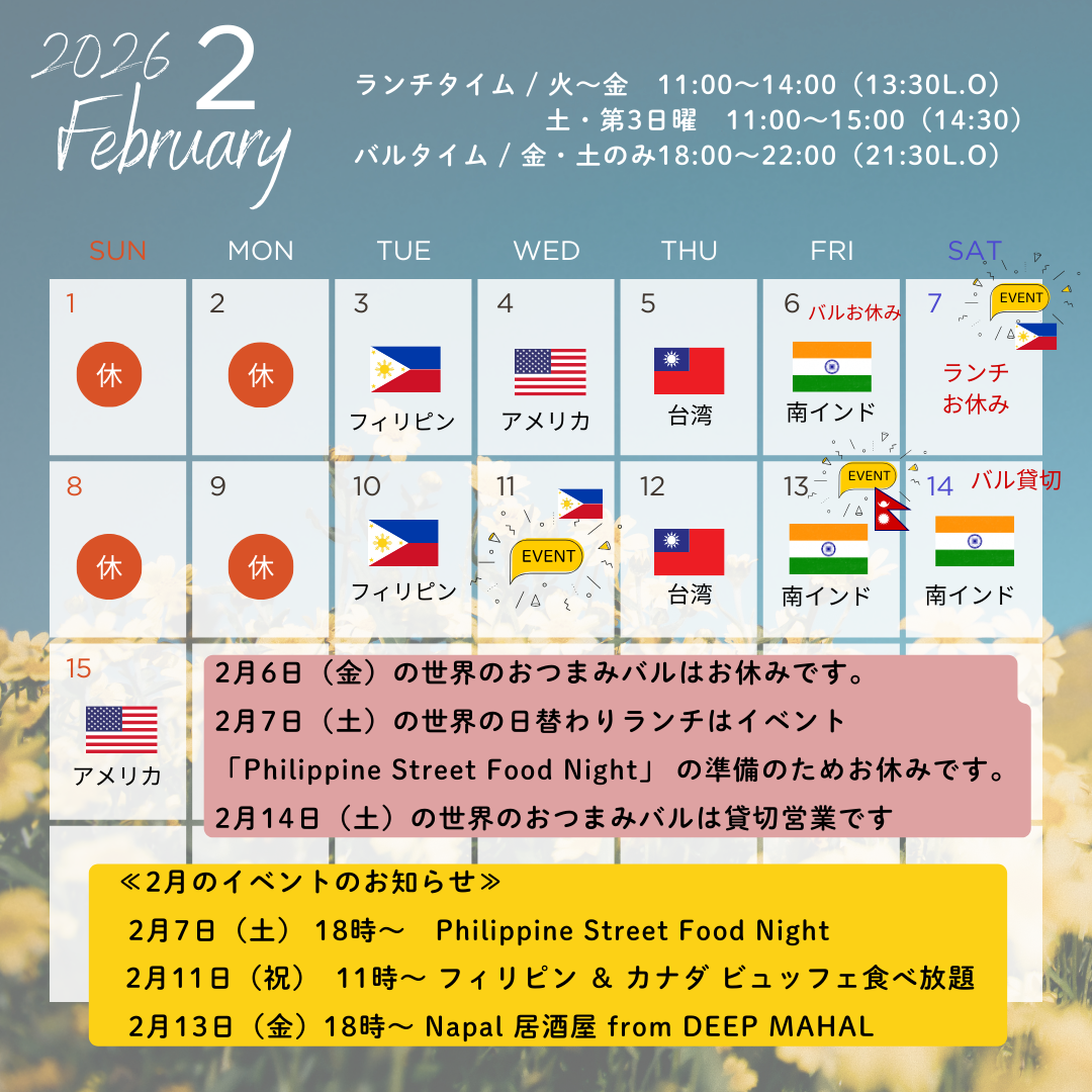ランチタイムは外国人シェフが料理をする世界の日替わりランチ、営業は火曜~金曜の11時~14時、土曜と第3日曜は11時~15時、
