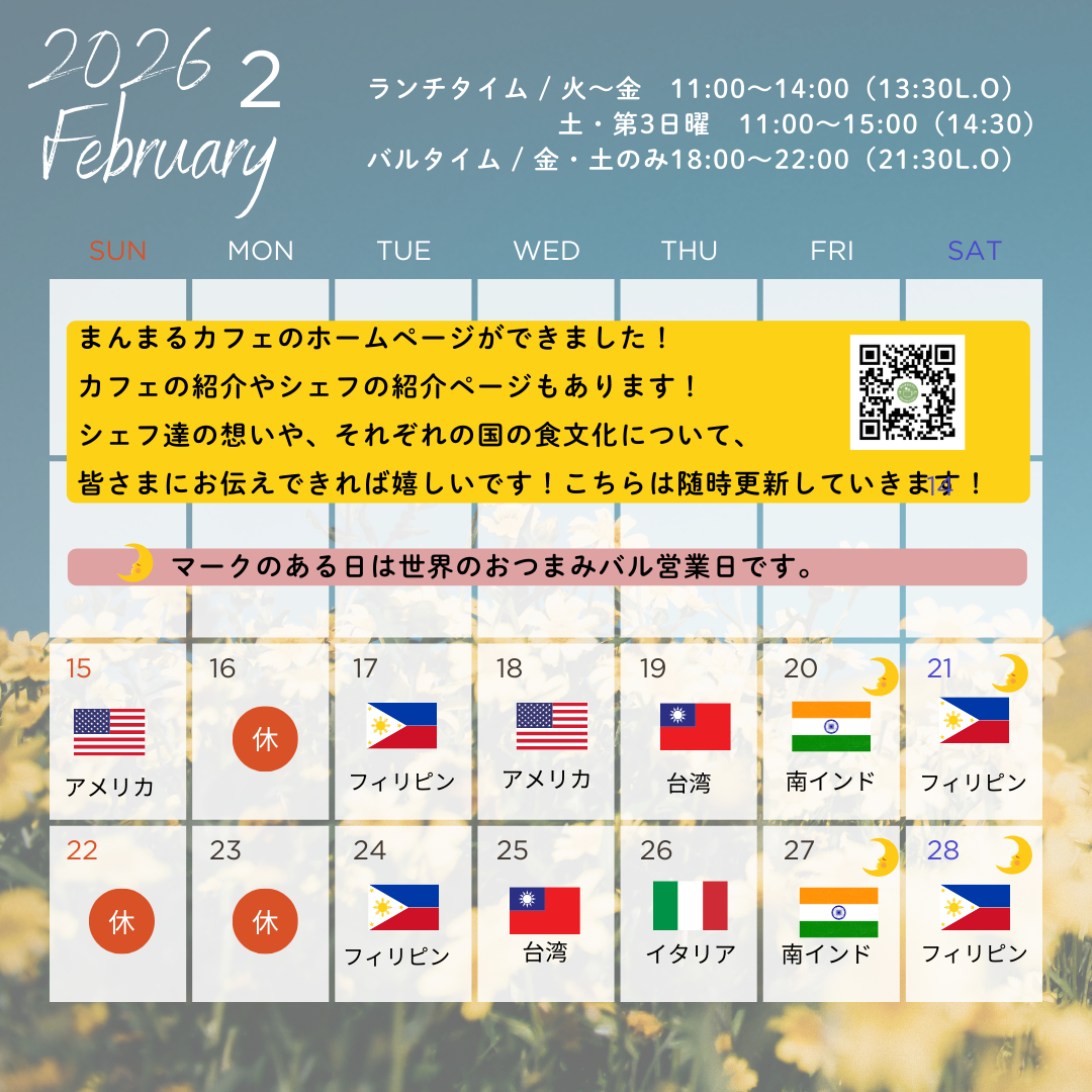 まんまるカフェのランチは、日替わりで各国の本場の料理を楽しんでいただけます。