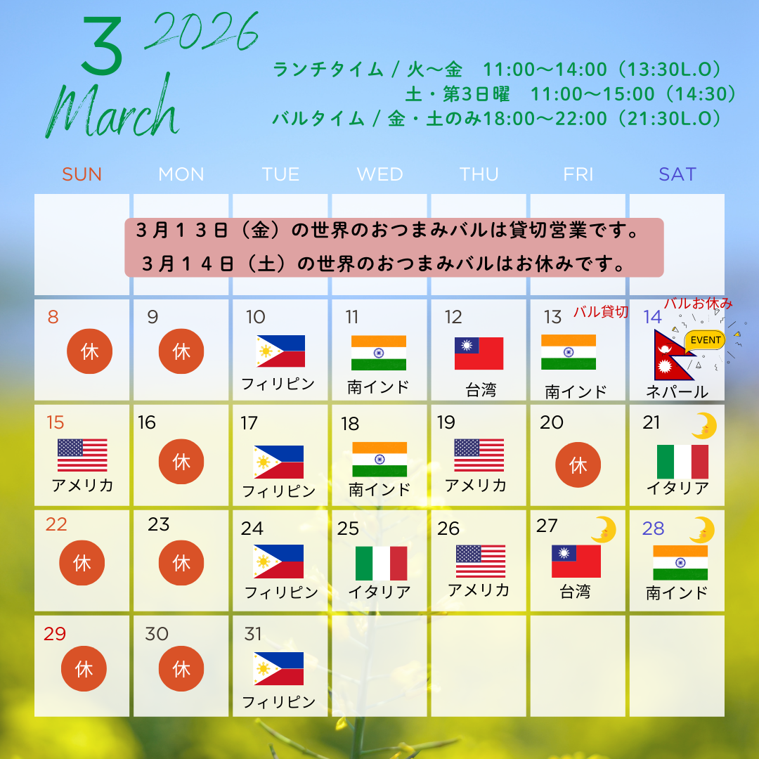 ランチタイムは外国人シェフが料理をする世界の日替わりランチ、営業は火曜~金曜の11時~14時、土曜と第3日曜は11時~15時、